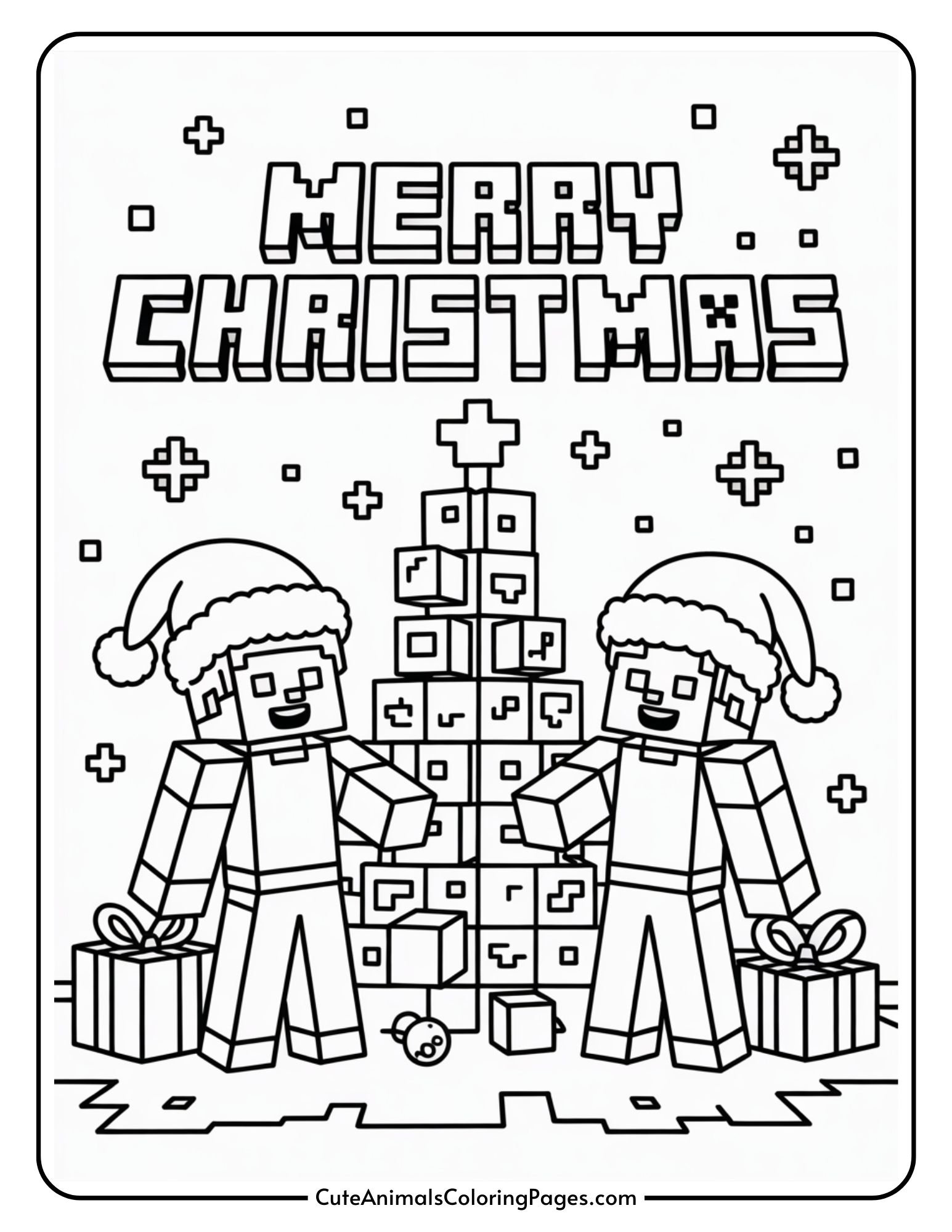 A coloring page featuring two blocky characters in Santa hats holding hands in front of a decorated blocky Christmas tree with presents and the words 'Merry Christmas' above.A coloring page featuring two blocky characters in Santa hats holding hands in front of a decorated blocky Christmas tree with presents and the words 'Merry Christmas' above.Needle