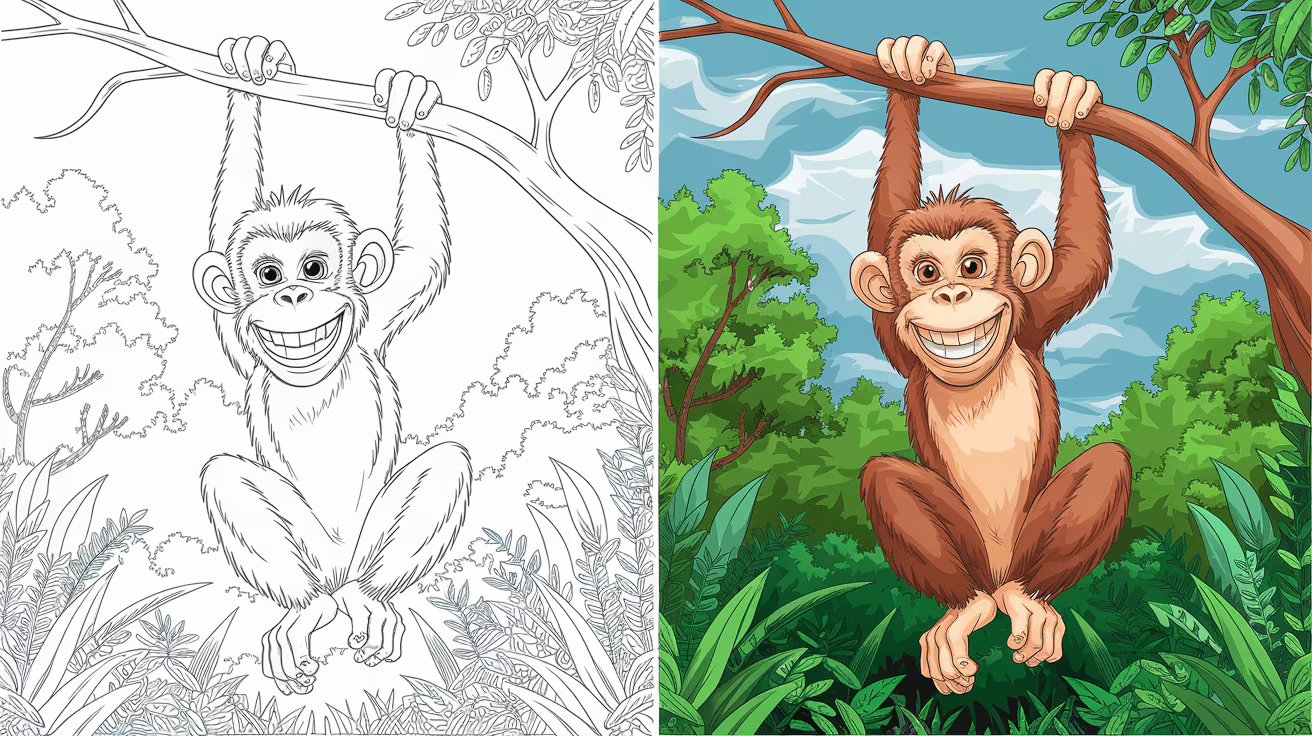 Give the scene a warm, dramatic background by coloring a sunset with vibrant oranges, pinks, and purples. Imagine the monkey enjoying an evening in the jungle, with the sky glowing behind. This idea can add depth and atmosphere to the coloring page.